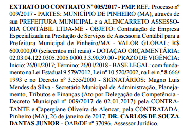 Em apenas 12 (doze) meses, a empresa Alencarreto Assessoria Contábil LTDA -ME vai faturar mais de meio milhão de reais dos cofres públicos da Prefeitura de Pinheiro, atualmente comandada por Luciano Genésio (PP).