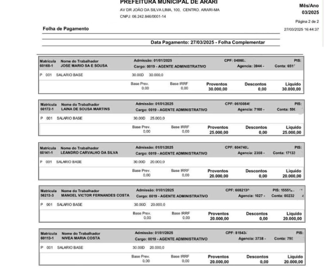 Parte da Folha de Pagamento da Prefeitura relativa ao mês de março de 2025, o qual foi divulgada pelas vereadoras autoras de denúncia, mostram, que o “salário base” dos Agente Administrativos é o mesmo valor do “salário liquido”, o que significa que a organização criminosa autora do esquema não se deu nem o trabalho de realizar os devidos descontos tributários na folha de pagamento da gestão municipal em Arari, cujo secretário Municipal de Educação é Alexandre da Costa Alves, filho adotivo da prefeita Maria.