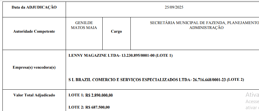 - Lote 01: Adjudicado à empresa LENNY MAGAZINE LTDA, situada na cidade de Viana, na Baixada Maranhense, com um valor de R$ 2.890.000,00 (dois milhões, oitocentos e noventa mil reais).