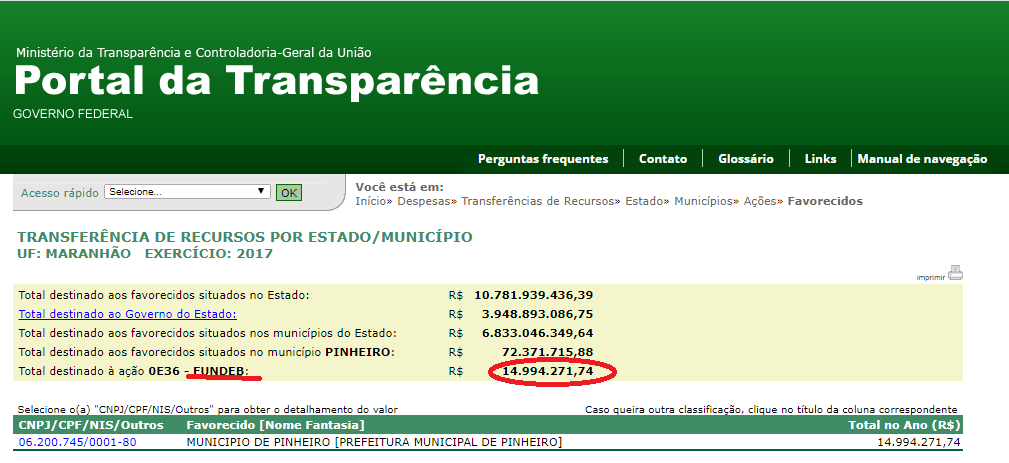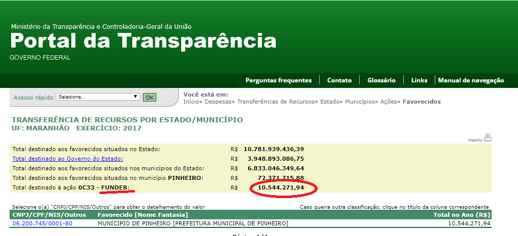 De acordo com o Portal da Transparência, dois repasses milionários foram feitos ao município de Pinheiro. “14.994.271,74” como complementação da União ao Fundo e mais “10.544.271,84” somando “25.538,543,58” ou seja, mais de vinte e cinco milhões e meios de reais para investir na educação.