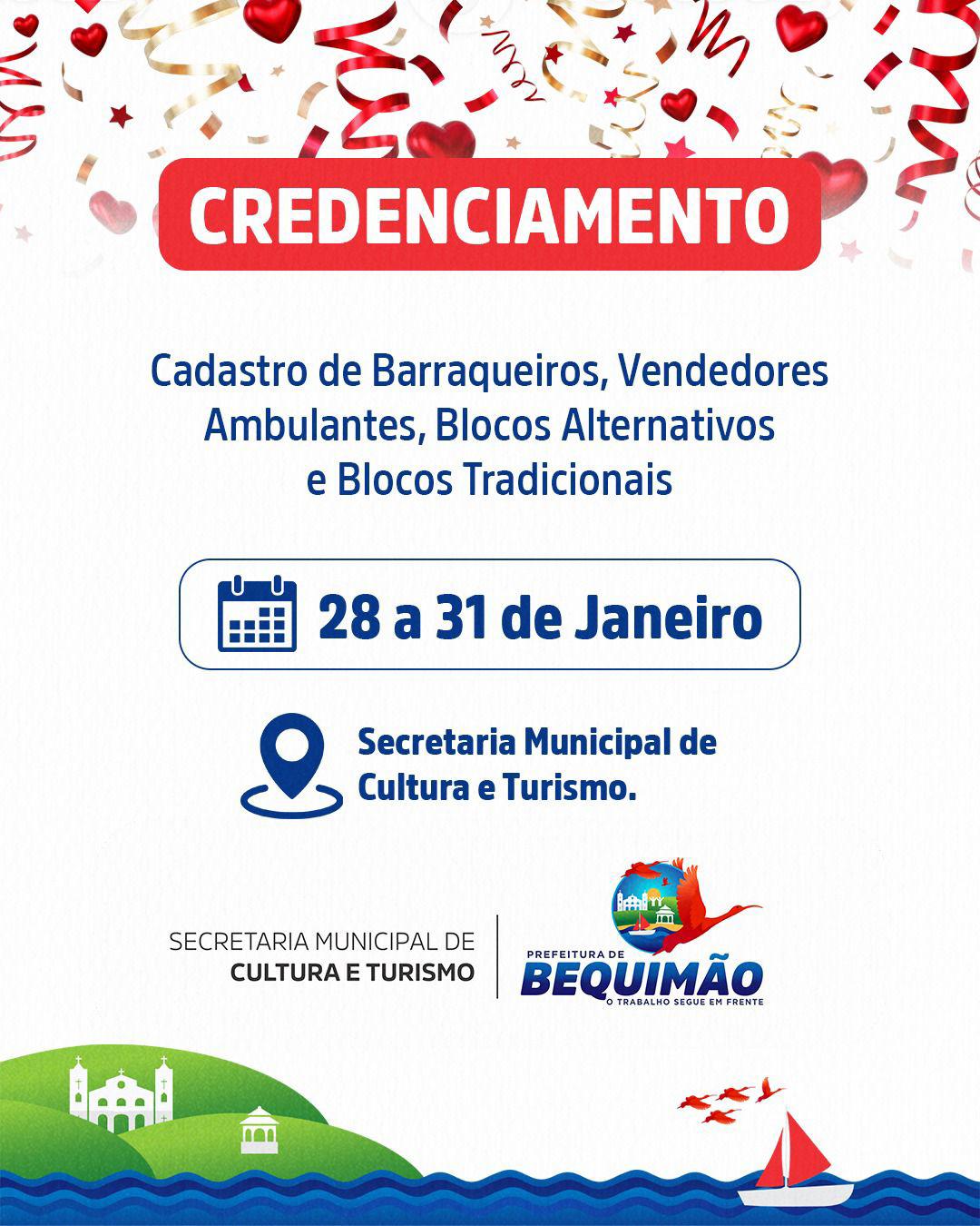 A Prefeitura de Bequimão, por meio da Secretaria Municipal de Cultura e Turismo, informa que o credenciamento para barraqueiros, vendedores ambulantes, blocos alternativos e blocos tradicionais já está aberto. A ação visa a organizar e garantir a participação desses profissionais e grupos durante o Carnaval de Bequimão, um dos eventos mais aguardados do município.